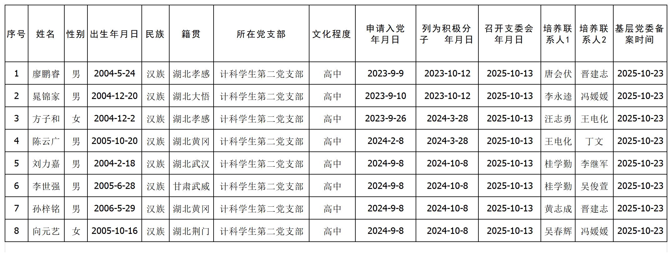 经本人申请、党内外群众意见征询,结合入党积极分子量化考核结果及现场答辩情况,经计算机科学与技术学生第二党支部委员会讨论研究,拟确定廖鹏睿等8名同志为发展对象。根据发展党员工作要求,现将有关情况公示如下: